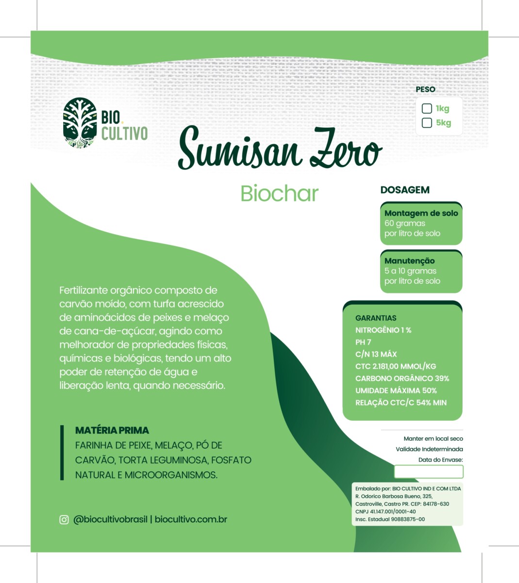 O Biochar Sumisan é um fertilizante orgânico com função de condicionador de solo, composto por pó de carvão vegetal, turfa e aminoácidos de peixe.