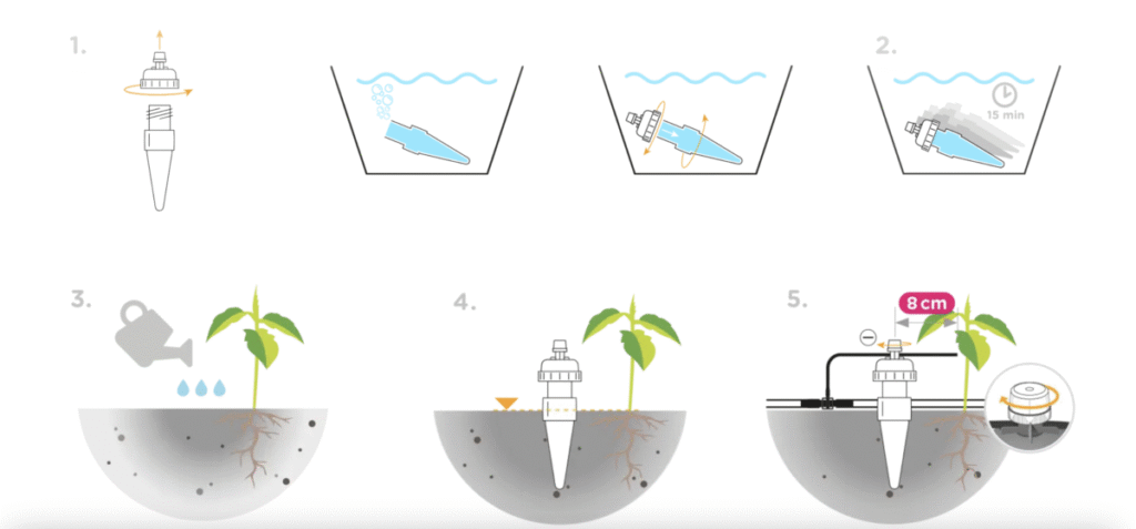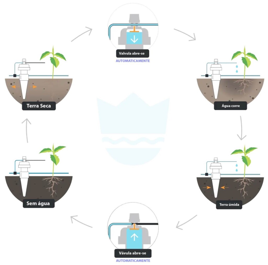 Cada Tropf-Blumat é um sensor que controla a rega da planta. O sensor reage diretamente à umidade do solo. Se o solo ficar seco, uma válvula se abre e a rega começa. Quando o solo estiver suficientemente úmido novamente, a liberação de água é interrompida automaticamente.