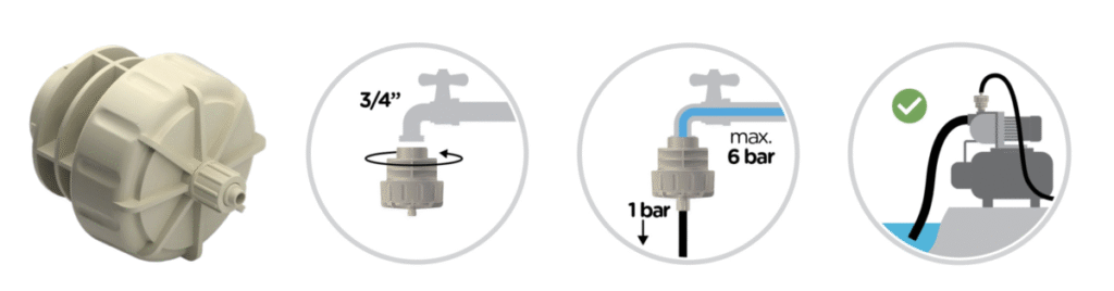 Conecte o redutor de pressão a uma torneira de água ou a uma bomba com um vaso de compensação.