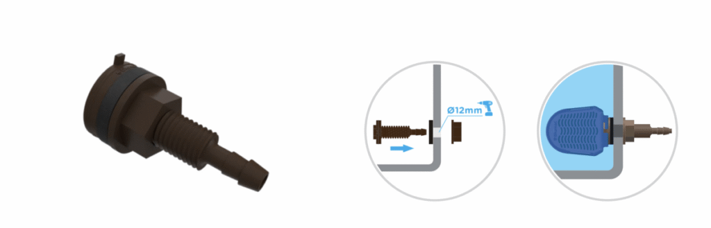 Adapte o conector do tanque a qualquer recipiente. Para isso, faça um furo com 12 mm de diâmetro.