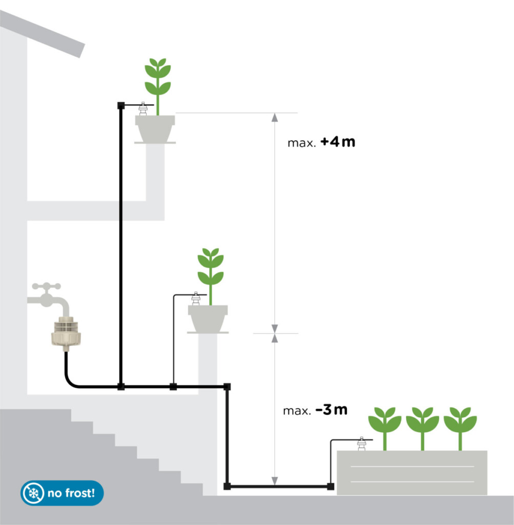 A instalação de um sistema Tropf-Blumat é fácil. Você não precisa de nenhum conhecimento prévio ou ferramentas, uma tesoura doméstica é suficiente. Uma vez instaladas, as linhas de abastecimento permanecem no lugar e não precisam ser removidas no inverno.
